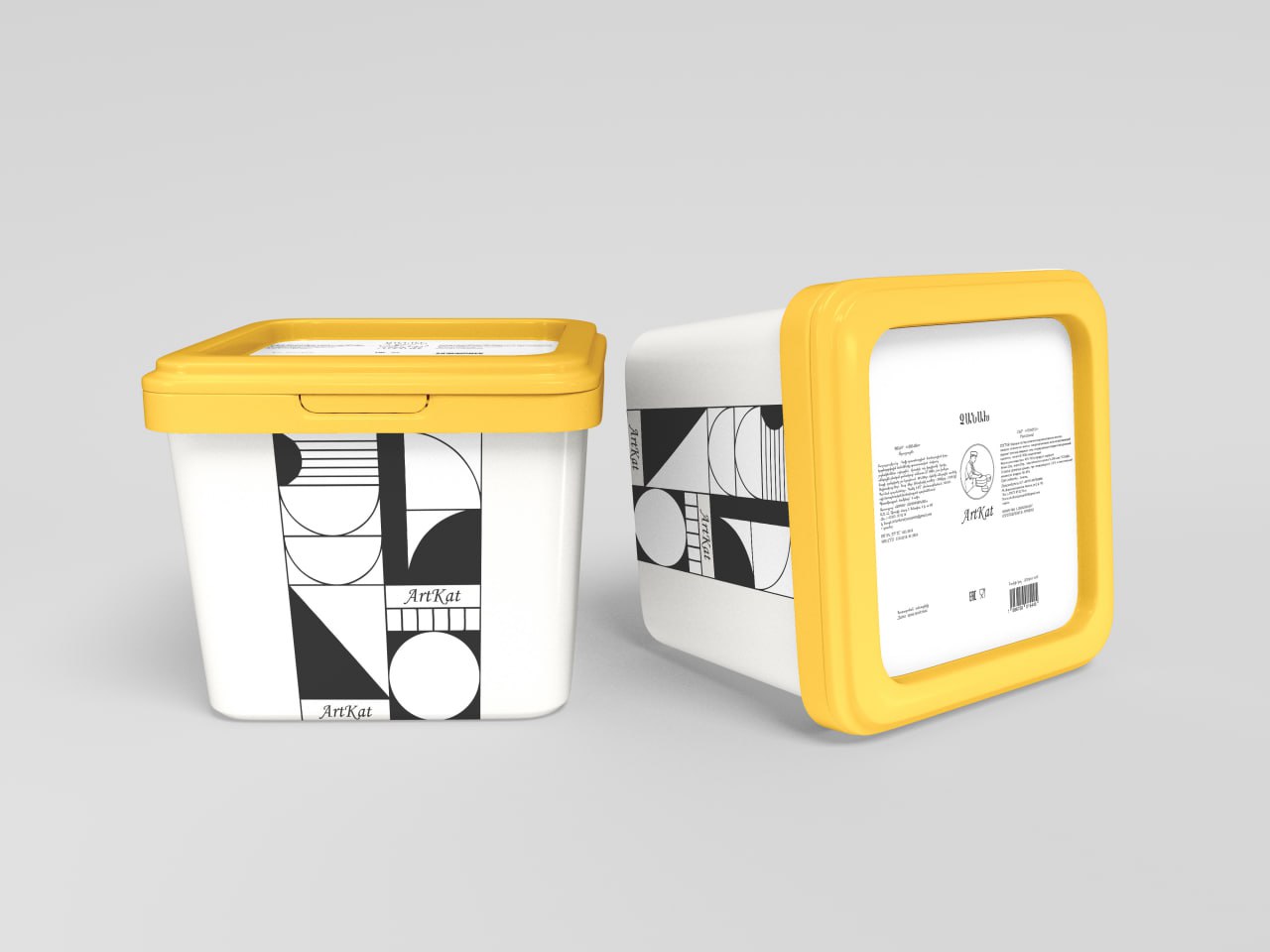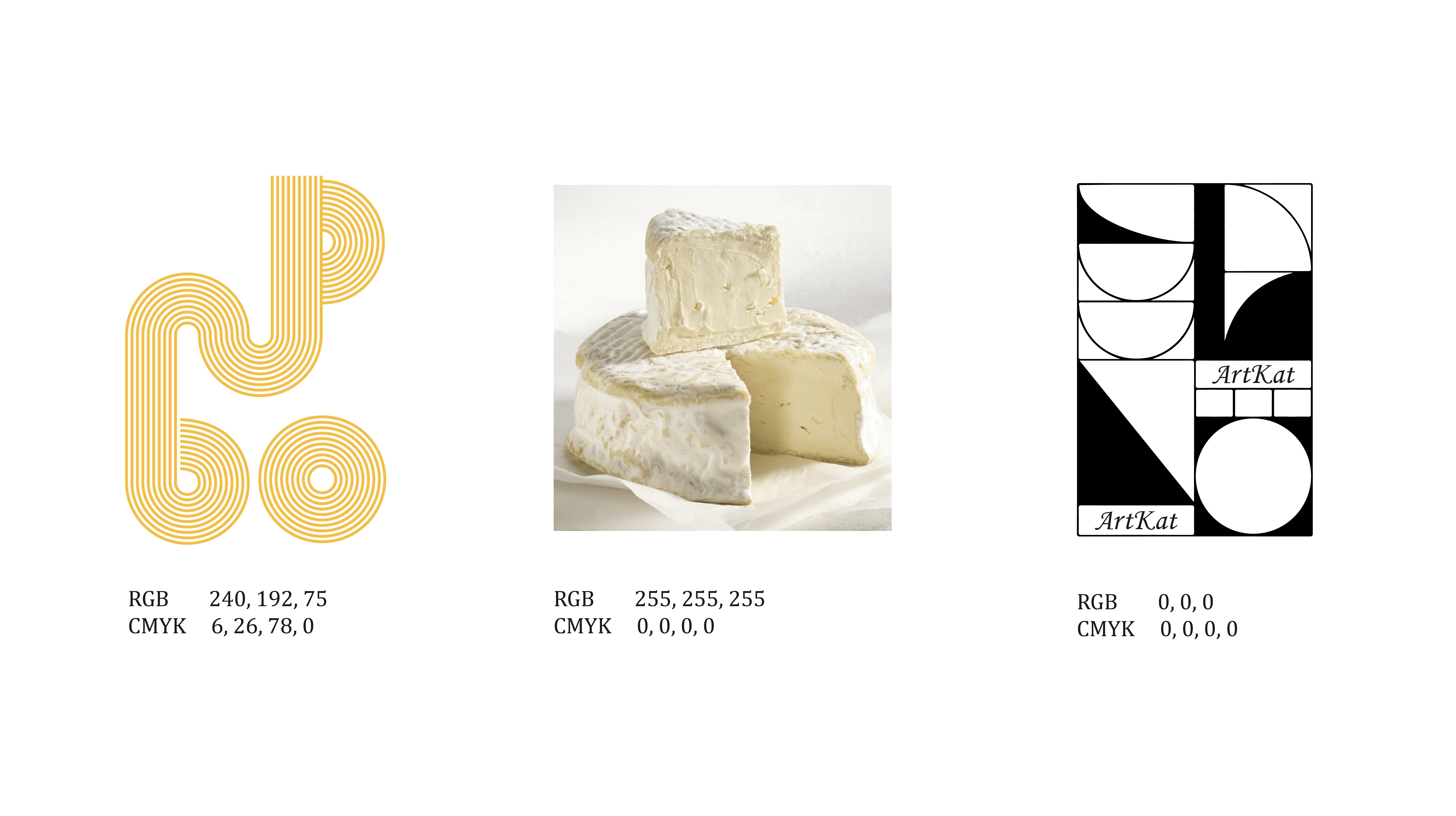 Since the name of the company is <Artkat>, which means art created from milk. This is not accidental, since the company maintains traditional cooking methods. I decided to design a clear geometric image that is comparable to the cut and details of cheese. Also, the cut emphasizes clarity and stability. I chose yellow as the color scheme, which speaks of the high quality of the product, and black and white - the clarity and strength of the company.